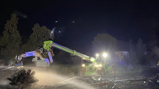 Mittels mehrerer C-Rohre wurde der Brand bekämpft und anschließend konnte der Stapel mit einem Teleskoplader abgetragen werden um alle Glutnester ablöschen zu können.